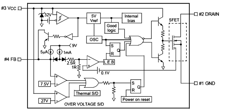 常規(guī)SMPS系統(tǒng)均采用PWM控制IC和場(chǎng)效應(yīng)管(FET)作為開關(guān),現(xiàn)在大多采用單片IC。這些單片IC針對(duì)各種功率級(jí)別和應(yīng)用進(jìn)行了優(yōu)化,一般分為雙芯片式單片IC和單芯片式單片IC兩類。雙芯片式單片IC內(nèi)部包括控制器芯片和MOSFET芯片,而單芯片式單片IC內(nèi)部?jī)H有一個(gè)芯片。 設(shè)計(jì)時(shí)的一般考慮是:在高功率應(yīng)用時(shí)選擇雙芯片方案,而在低功率應(yīng)用時(shí)則選擇單芯片方案,高低功率的分界點(diǎn)在15~20W左右。飛兆半導(dǎo)體生產(chǎn)的KA5M0365R是雙芯片器件,其價(jià)格便宜,成為方案設(shè)計(jì)時(shí)的首選單片SMPS電路。 掌上DVD用開關(guān)電源適配器要求有很高的保護(hù)功能,KA5M0365R同時(shí)具有過載保護(hù)、過壓保護(hù)、過流保護(hù)、欠壓保護(hù)和過熱保護(hù)特性。KA5M0365R的主要功能與特點(diǎn)是: ①內(nèi)部框圖(見圖1);