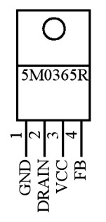 ![]() 圖2 KA5M0365R引腳排列圖 1腳-接地端(GND) 2腳-漏極輸出端(DRAIN) 3腳-VCC端(VCC) 4腳-反饋端(FB) ③漏源反壓650V;④25℃連續(xù)漏極直流電流額定值3A,100℃連續(xù)漏極直流電流額定值2.4A;⑤內(nèi)置精密振蕩工作頻率67KHz;⑥低啟動(dòng)電流(典型值100μA);⑦電流限制調(diào)整功能;⑧過流保護(hù);⑨過壓保護(hù);○10內(nèi)置過熱保護(hù)功能;○11低電壓閉鎖;○12內(nèi)置高壓SenseFET;○13自動(dòng)重啟功能。 2.電源適配器電路結(jié)構(gòu) 圖3給出了適配器的電路圖。電路中采用KA5M0365R構(gòu)成了連續(xù)電流模式(CCM)的反激式開關(guān)電源適配器。 接通電源適配器后,交流電壓自線路輸入端輸入,經(jīng)過一個(gè)用于抑制EMI的濾波器(C1、T1)、橋型整流器(D1~D4)和濾波電容器(C2),產(chǎn)生直流高壓。R8是U1的啟動(dòng)電阻。在第一次接通電源時(shí),U1以旁路模式工作,C8被充電,一旦達(dá)到電壓鎖定閾值15V范圍的上限,U1就開始開關(guān),其電流需求增加,VCC電壓開始下降。但假定C8容量足夠大,VCC電壓仍會(huì)保持在電壓鎖定閾值范圍的較低水平,在正常工作期間,反饋繞組提供的反饋電壓經(jīng)D6、C8整流后,產(chǎn)生直流電壓開始為U1供電。 漏極箝位保護(hù)電路(緩沖網(wǎng)絡(luò)SnubberNet-work)由C3、R7、D5組成,可將漏極關(guān)斷時(shí)由于電源適配器變壓器泄漏電感而在初級(jí)產(chǎn)生的尖峰電壓限定在安全范圍內(nèi),以確保電源適配器不會(huì)造成開關(guān)漏極電壓超過其擊穿電壓。