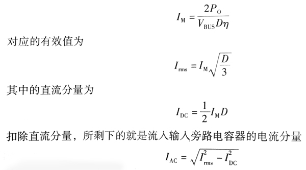 5.3.5整流濾波電容器的真實選擇 1.承擔整流濾波和旁路的電容器選擇 對于承擔整流濾波和旁路功能的電容器來說,需要相對很大的電容量,因此電解電容器成為“”的選擇?在實際應(yīng)用中,電解電容器的承載電流能力比較低,在實際應(yīng)用中近根據(jù)整流濾波電容器的較低電容量選擇依據(jù)選擇的電容量,電容器將不能承受電路整流電路和反激式變換器所產(chǎn)生的交流電流分量。 85-265V國際通用電壓等級交流電輸入狀態(tài)下,整流濾波電容器承受約27mA/W的紋波電流有效值。 220V交流電壓等級在較低輸入電壓狀態(tài)下,整流濾波電容器承受約13.3mA/W的紋波電流有效值。 因此,在大多數(shù)的應(yīng)用中電源適配器中的濾波用電解電容器的選擇需要根據(jù)電解電容器可以承受的電流選擇。 例如輸出功率為24W的反激式電源適配器,如果輸入電壓為85~265V國際通用電壓等 級,則整流濾波電容器將承受約0.65A有效值電流,至少需要選擇100μF/400V的電解電容器,通常100μF/400V的電解電容器可以承受0.5~0.7A有效值電流,這個電容器也超過了72uF的較低電容量。 如果同樣的24W的反激式電源適配器,采用220V電壓等級交流電供電,則整流濾波電容器流過的紋波電流為0.32~0.33A,33μF/400V電解電容器時可以承受這個幅值的是有效電流的。 由于電解電容器的可承受紋波電流能力并不是隨電容量線性增長的,因此隨著電源適配器輸出功率的增大,隨需要的電容量將更大。 如輸出功率為100w的反激式電源適配器,在85~265V國際通用電壓等級供電條件下,整流濾波電容器將承受2.7A有效值電流,220μF/400V的電解電容器較大電流承受能力( chemi-con公司的SMQ系列85℃/2000小時型)較大不過1.4A,即便是470μF/400V的電解電容器的承受電流能力也不過2.39A,需要選用560μF/400v的電解電容器(2.69A)。 如果選用220V電源電壓等級供電,則電容量可以減小到220μF/400V。 如果不是高紋波電流產(chǎn)品,則需要按電解電容器實際可以承受的有效值電流選擇電容量。 2. 僅承擔旁路功能的電容器選擇 直流供電的反激式電源適配器的電容器選型首先要滿足紋波電流的條件,然后再考慮電容量對濾除電源紋波電壓的影響。 紋波電流的考慮需要記住以下公式: 反激式變換器想直流供電電源索取的電流峰值為