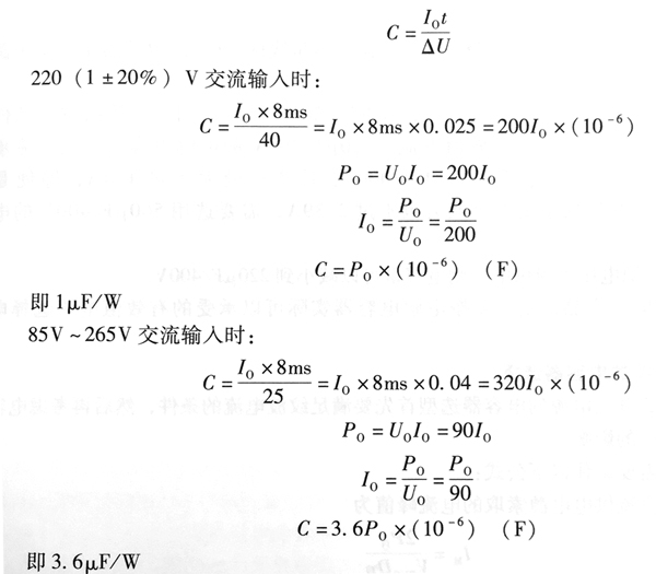 每半個電源周波(10ms),整流器導(dǎo)電時間約3ms,其余7ms為濾波電容器放電時間,承擔向負載提供全部電流,則:濾波電容器容量為0.88μF/W和3.15μF/W。