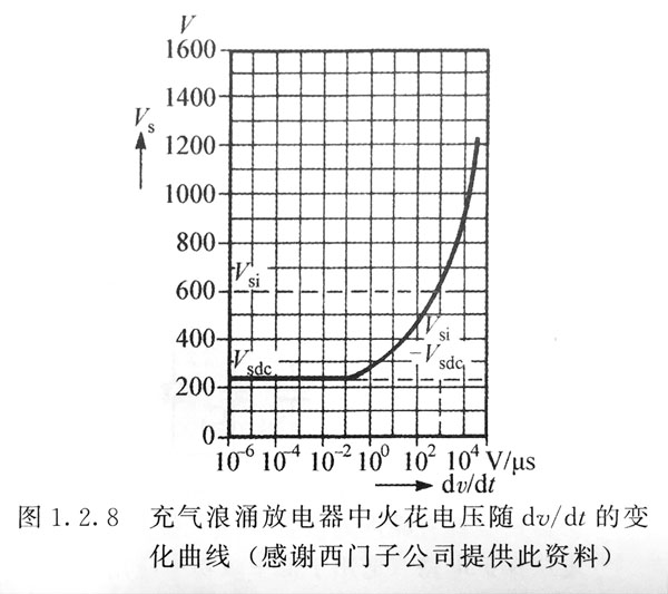 充氣浪涌放電器的一個缺點是其對過壓應(yīng)力的反應(yīng)速度相對慢。等離子體的形成過程是相當慢的,而起弧電壓與dv/dt有關(guān)。如圖1.2.8所示,一個典型的270V裝置中起弧電壓是dv/dt的函數(shù),這種效應(yīng)在瞬變尖峰沖擊速率為10V/us時是非常明顯的,因此,對快速瞬變過程來說,充氣浪涌放電器必須有濾波器或快速反應(yīng)的鉗位裝置的支持。