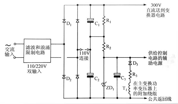 當(dāng)變換器工作時,輔助充電器從主變壓器T1的一個繞組獲得補(bǔ)償,避免了C3進(jìn)一步地電并保持輔助充電器電壓穩(wěn)定。 對這種方法的主要要求是要有足夠的啟動延時,讓主變換器允許C3完全充電。再者,為了正確啟動變換器,C3必須足夠大以存儲足夠的能量供給驅(qū)動電路。 在此電路中,R1和R2始終存在于電路中。為了防止過多的損耗,它們的阻值必須很大,因此在變換器啟動之前,驅(qū)動電路的待機(jī)電流必須很低。因?yàn)镃3可能相當(dāng)大,在C3充滿電之前可能有200ms~300ms的延時,為了在第一個周期運(yùn)行中確保良好的開關(guān)動作,C3必須在啟動之前充滿電,這就要求在啟動控制和驅(qū)動電路中有低壓禁止和延時的措施。 這種技術(shù)的優(yōu)點(diǎn)是價格非常低,并且電阻R1和R2能代替儲能電容C1和C2兩端必不可少的普通安全放電電阻。