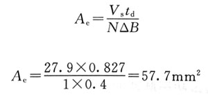 其中,這里有匝數(shù)和磁心面積兩個(gè)變量可用于電壓的較后調(diào)整。為了方便起見,這里假設(shè)采用原邊繞組匝數(shù)為1,即從變壓器來的輸出導(dǎo)線只是簡(jiǎn)單地通過環(huán)形繞組。現(xiàn)在,這里就只剩下一個(gè)變量,即磁心面積。而所需要的磁心截面積可以由下式來計(jì)算: