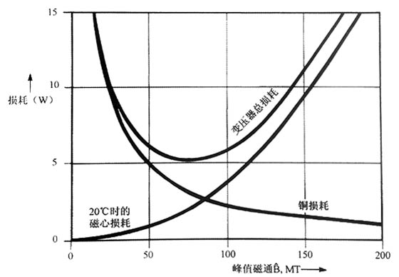 圖典型開關式變壓器在具有較佳繞制性能時,一對A16鐵氧體EE55-55-21磁心的磁心損耗,銅損耗和總損耗。損耗是峰值磁通密度的函數(shù)。注意到當變壓器電感(匝數(shù))為較佳時出現(xiàn)較小總損耗,此時磁心損耗是總損耗的44%