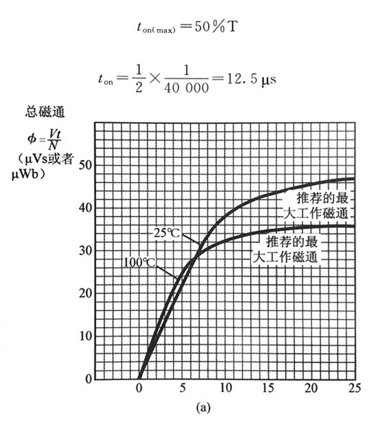 步驟5,計算原邊匝數(shù) 導通期間加到變壓器原邊的電壓波形是矩形,可以使用伏秒方法(法拉第定理)來計算匝數(shù)。 在推挽變壓器中,兩個象限的B/H磁環(huán)都要使用,而在穩(wěn)態(tài)平衡條件下,磁通密度偏移在正半周內(nèi)將從一B變化到+B。 應該注意圖2。13。4表示的是峰值磁通密度B,但假設損耗是對峰峰磁通密度偏移△B(2×B)而言的。對于較佳效率,選擇的B是100mT。因此,本例中峰峰變化(磁通偏移擺幅)△B=2×B或=200mT EE5-5-21的磁心面積是354mm2,原邊匝數(shù)由下式計算