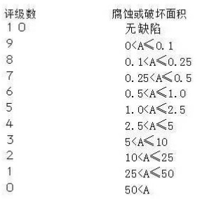 評定結(jié)果為 Ri后加一個阿拉伯數(shù)字,如 Ri6, Ri4.數(shù)字表示腐蝕面積 數(shù)字與腐蝕面積對應關系如下: