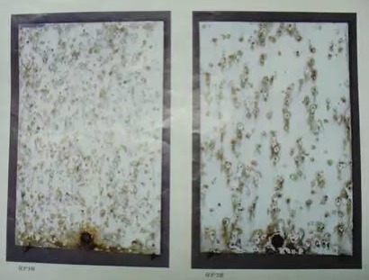 試驗結(jié)束后取出試樣,在室內(nèi)自然干燥 0.5~1 小時,然后用溫度不高于 40 攝氏度的清潔流動水輕輕沖洗,以除去殘留的鹽霧溶液,再立即吹風機吹干. 五、試樣評級 評級標準選擇