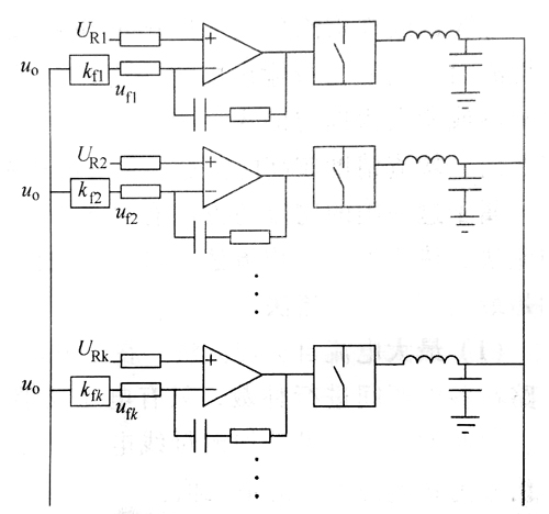 所有120w電源適配器輸出連接在一起,因此它們的輸出電壓a?都是相同的,但每個電源適配器的給定量Un?反饋比例系數ka略有差異,再考慮到運放的失調電壓也不盡相同,因此各電源適配器誤差信號c=Um-k?也各不相同(本小節中下角標k均表示第k個電源適配器)?各電源適配器的電壓調節器通常都采用比例一積分(P)調節器?