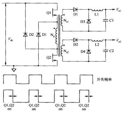 | 基本原理 電源適配器雙端正激變換器拓?fù)淙鐖D所示的單管單端(以下簡(jiǎn)稱單端)正激變換器使用單個(gè)開(kāi)關(guān)管不同,雙端正激變換器使用兩個(gè)開(kāi)關(guān)管,且這樣有顯著的優(yōu)點(diǎn)。即關(guān)斷時(shí),每個(gè)開(kāi)關(guān)管僅承受一倍直流輸入電壓(單端正激變換器中為兩倍直流輸入電壓)。另外,關(guān)斷時(shí)也不出現(xiàn)漏感尖峰。 曾指出,考慮到15%的瞬態(tài)誤差、0%的穩(wěn)態(tài)誤差和30%的漏感尖峰,交流輸入為額定電壓120V的單端正激變換器的關(guān)斷電壓應(yīng)力高達(dá)550V。 盡管許多雙極型晶體管額定V。高達(dá)650V甚至850V,能夠承受這樣的電壓應(yīng)力,但使用只承受一半關(guān)斷電壓應(yīng)力的雙端正激變換器要更可靠。可靠性是開(kāi)關(guān)電源適配器設(shè)計(jì)中重要的考慮因素。若權(quán)衡可靠性與原始成本,則較好的、從長(zhǎng)遠(yuǎn)看也是較經(jīng)濟(jì)的選擇是可靠性。 而且,對(duì)于用于歐洲市場(chǎng)的電源適配器(那里交流電壓為220V,整流后額定直流電壓約為308V),根本不能使用單端正激變換器,因?yàn)殚_(kāi)關(guān)管關(guān)斷時(shí)電壓應(yīng)力太大。用于歐洲市場(chǎng)的產(chǎn)品,只能采用雙端正激變換器、半橋或全橋電路。 下面來(lái)樣定做電源適配器雙端正激變換器的工作原理。如圖所示,Q1和Q2分別串接于變壓器初級(jí)的頂端和底端。兩個(gè)開(kāi)關(guān)管同時(shí)導(dǎo)通和關(guān)斷。當(dāng)它們導(dǎo)通時(shí),所有初級(jí)和次級(jí)的同名端為正功率傳遞給負(fù)載。當(dāng)它們關(guān)斷時(shí),存儲(chǔ)于們勵(lì)磁電感上的電流使所有繞組電壓極性反向。Np的同名端電位被二極管D1鉗位至地電位。N的異名端電位被二極管D2鉗位于Vdc。