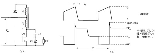 (a)由R1、C1、D1組成的正激變換器的緩沖電路。Q1關斷時,集電極電壓開始上升,D1隨即導通,Cl抑制集電極電壓上升的速度,減小上升電壓和下降電流的重疊,從而降低品體管Q1的損耗。在下次晶體管關斷之前,C1必須在Q1的導通時間內將上一次關斷時充的2V放完,放電路徑為R1、Q1。(b)無緩沖電路時,集電極電壓瞬時升高,Q1的損耗是  。