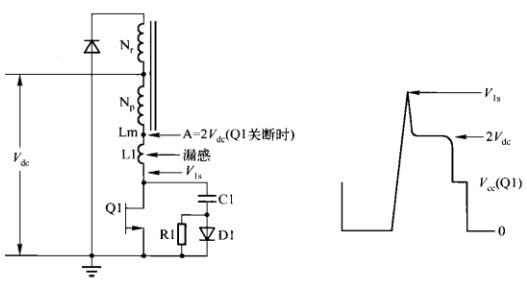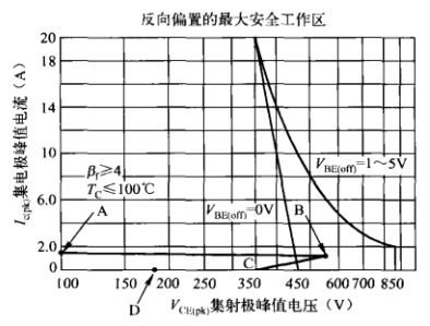 ![]() 若Q1關斷之前流過它的峰值電流為3.45A,則漏感尖峰幅值為(3.45/2)x103=178V因此,晶體管承受的的峰值電壓為2V+178=547V。雖然上述計算并非非常精確,但這一漏感尖峰的值足以解釋產生二次擊穿的原因了。 圖中,美規充電器關斷前Q1工作在集電極電壓一電流曲線的A點,電流值為3.45A,電壓值近乎為0V。晶體管關斷時,它的負載線軌跡為ABCD。關斷瞬時漏感維持總電流大小不變,但是原先流過晶體管Q1的電流1的一半流向C1,剩下的1。73A的電流仍流過Q1。品體管集電極電壓一電流工作點沿著AB軌跡線水平移動。在B點,電流仍然為1。73A,而電壓為547V。短暫的漏感尖峰持續時間后,集電極電壓恢復到2V,直到磁心復位之后,集電極電壓才恢復到V,并保持到下一次導通之前(見圖)。由圖可知,如果關斷時晶體管上有5V反向電壓,則547V,1.73A時晶體管仍工作在 RBSOA曲線內,二次擊穿是不會發生的。如果不在基極加反向電壓,晶體管工作狀態就會超越 RBSOA曲線,就有可能二次擊穿。 因此,雖然緩沖電容的首要作用是延長集電極電壓的上升時間,但還需要選擇比式計算出來的值大的電容來減小漏感尖峰。當電源適配器輸出功率較大時,即使有5V的基極反向驅動來加速關斷,但由于關斷負載曲線水平部分的電流很大,漏感尖峰仍然可能超出RBSOA曲線。這就更需要容值更高的緩沖電容。