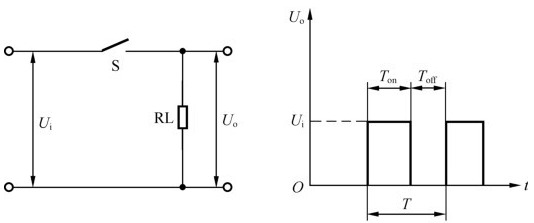 圖電源適配器示意圖及輸入/輸出波形圖中,Ui為整流后不穩定的直流電壓;Uo為經過斬波的輸出電壓;S為開關控制器件;RL為負載;T為開關啟閉周期;Ton為開關閉合時間,即導通時間;Toff為開關斷開時間,即截止時間。
