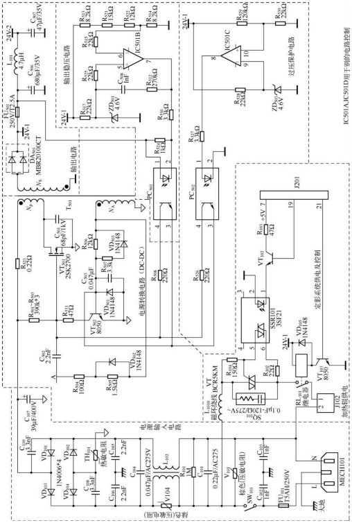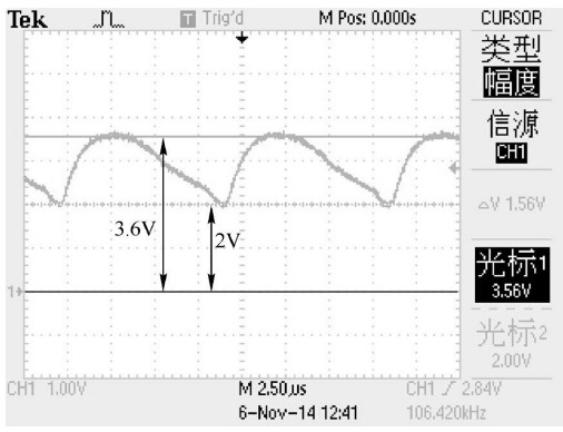 目前許多打印機使用自激式電源適配器,根據(jù)功能和打印方式的不同,打印機可分為針式打印機、票據(jù)打印機、噴墨打印機、激光打印機等多種。圖3-33為惠普HP1018激光打印機電源適配器原理圖,主要由市電交流輸入及轉換、定影系統(tǒng)供電、主電源適配器等電路構成。各部分電路工作原理如下。![]() 1.市電輸入及轉換 電源適配器輸入電路是指高頻干擾抑制、整流和濾波電路。其作用是把電網的工頻交流電轉換為平滑的直流電,給電源適配器提供輸入電壓,并抑制和濾除輸入端的高頻雙向干擾。有關輸入電路各元器件的作用可參見第2章中的表2-3。 2.定影系統(tǒng)供電及控制 通電后,打印機CPU經由接插件J201的19、21腳送入高電平,因J201的7腳為+5V(來自于主控板),VT102與VT103均導通。其中,VT102導通,經光耦SSR101(3SF21)給雙向可控硅VT101(BCR5KM)提供觸發(fā)信號使其導通;VT103導通,繼電器RL101觸點吸合,此時市電通過接插件J101為陶瓷片供電加熱。當加熱陶瓷片的溫度達到185℃左右時,接插件J201的19腳變?yōu)榈碗娖?,VT102截止,VT101關斷,陶瓷片加熱停止,與此同時,微處理器發(fā)出指令使“準備好”燈點亮。 另外,該機具有節(jié)能功能。如果在設定時間內打印機仍未工作,則接插件J201的21腳變?yōu)榈碗娖?,VT103截止,繼電器RL101觸點釋放,機器進入待機狀態(tài)。二極管VD105反并聯(lián)于繼電器RL101供電線圈兩端,在VT103截止時吸收線圈瞬間感應電壓,對VT103起保護作用。 雙向可控硅VT101主回路兩端并聯(lián)的SQ101是一個阻容串聯(lián)復合體,復合體電阻為120Ω,電容為0.1μF/AC275V。在可控硅關斷瞬間,阻容復合體吸收感性負載的瞬變高壓(也可以理解為“剩余能量”)保護可控硅。這種阻容復合體吸收電路在交流市電的可控硅供電系統(tǒng)中已經成為必選。 3.主電源 該機是由功率管VT501(2SK2700是MOSFET)和開關變壓器T501為核心構成的自激式電源適配器。 (1)開關管VT501的開關過程 輸入整流濾波電壓約為300V:一路經保險電阻R523(0.22Ω)、T501主繞組NP加到開關管漏極(D);另一路經R501~R503給VT501提供啟動電壓。輔助繞組NA經阻容元件與開關管VT501組成振蕩電路,VT501是開關管兼振蕩管。高壓電容C501(680pF/1kV)并聯(lián)在VT501的漏—源極之間,用于抑制VT501關斷瞬間NP產生的浪涌電壓。 VT501導通時,NA同名端(黑圓圈)為正極性電壓:一方面經R504、R505和C502送到功率管柵極加速其導通;另一方面經R506給C503充電,C503兩端電壓約為0.6V時VT502開始導通,并聯(lián)于VT502發(fā)射結的電容C503兩端正電壓被鉗位。由于C503充電時間常數(shù)較大,故在VT501導通一段時間后VT502才導通,降低VT501柵極與源極之間的電壓,VT501漏極電流減小,變壓器所有繞組電壓極性反轉。NA同名端負極性的電壓一路經R504、VD502和C502(VD502旁路R505)加到VT501柵極加速其截止;另一路經R507和VD503給C503放電(R506阻值較大,被R507和VD503旁路),促使VT502退出導通,轉為截止。繼續(xù)放電約為-0.6V時VD501開始導通,此時電容C503兩端負電壓被VD501鉗位。 圖為某負載時以A點為參考零電位時測得的功率管柵極(G)電壓波形。可見,柵極電位(G)始終高于A點電位,振幅約為1.6V。 ![]() 由上述分析可知,VT501柵極通路電容C502充、放電的通路不同,VT502發(fā)射結并聯(lián)電容C503充、放電的通路也不同,它們均是充電時間常數(shù)大、充電慢,放電時間常數(shù)小、放電快。C502的充電時間設定了開關管VT501導通的較大脈沖寬度,在此脈寬之內受控于脈寬調制管VT502;其充電慢、放電快有利于VT501快速截止。C503充電慢是為了滿足VT501具有較大導通脈沖寬度,放電快是便于進入下一個控制周期。 (2)穩(wěn)壓控制 整流管DA501是共陰極(肖特基)二極管,F(xiàn)U501是延時型可恢復保險絲(防止輸出短路)。整流后的脈動電壓經由C506、L101和C507組成的π形濾波器變成紋波很小的直流電。 穩(wěn)壓電路受光耦PC501和集成運放IC501B控制。R517與ZD501產生4.6V基準電壓,經R525加到IC501B反相端(5腳),輸出電壓經R513、R521、R522(9)和R514串聯(lián)產生采樣電壓,經R515加到IC501B同相端(6腳)。由于某種原因導致輸出電壓升高,則IC501B同相端(6腳)電壓升高,輸出端(7腳)電壓隨之降低,光耦PC501光電二極管發(fā)光增強(導通電壓約為1V),光電晶體管的等效電阻減小。此時,VT501柵極正脈沖電壓經R508、PC501對C503充電速度加快,VT502提前導通,VT501提前截止,占空比變小,輸出的電壓隨之下降,從而實現(xiàn)穩(wěn)壓控制。由于某種原因導致當輸出電壓升高,有關節(jié)點電壓的變化趨勢如圖3-35所示中的①~⑥,即輸出電壓意外上升后,經一系列反饋,后面導致占空比減小,從而保持輸出電壓穩(wěn)定。 ![]() 由上述工作原理分析,則輸出電壓UO為 ![]() 式中,4.6V為穩(wěn)壓二極管ZD501的參數(shù)。代入原理圖中有關元件參數(shù)可得 ![]() 電路中,R512與C508串聯(lián)后,并聯(lián)在IC501B同相輸入端與輸出端之間用作頻率補償。 (3)過壓保護 過壓保護電路主要由IC501C和光電耦合器PC502組成。R528與ZD503組成二極管穩(wěn)壓電路加到IC501C反相端(9腳),電壓為4.6V;輸出電壓經R529和R530采樣加到IC501C同相端(10腳)。 當集成運放IC501B或光耦PC501出現(xiàn)異常,引起電源適配器輸出電壓接近大約30V[4.6×(1+R529/R530)]時,IC501C的同相端(10腳)接近4.6V,IC501C(8腳)輸出高電平(實測為7.5V),經R527加到光耦PC502的1腳,PC501接替PC501控制VT502,進而影響功率管
