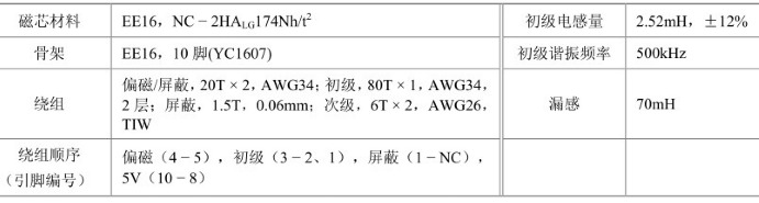 ③合理選擇R3的值,將空載功耗降至較低。④偏置元件VD6、C5及R3是可選件,如果移除這些可選件,空載功耗將會小于500mW。圖所示電路中變壓器的參數見表。