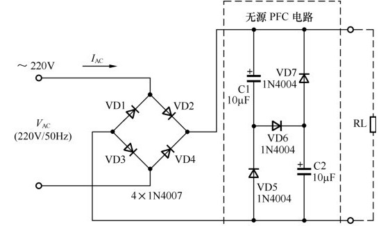 無源PFC電路不使用三極管等有源器件,而是由二極管、電阻、電容和電感等無源器件組成。無源PFC電路有很多類型,其中比較簡單的無源PFC電路由3只二極管和2只電容組成,如圖所示。