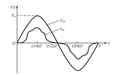 這種電源適配器無源PFC電路的工作原理是:當50Hz的AC線路電壓按正弦規律由零向峰值Vm變化的1/4周期內(即在0<t≤5ms期間),橋式整流器中二極管VD2和VD3導通(VD1和VD4截止),電流對電容C1并經二極管VD6對C2充電。當VAC瞬時值達到Vm,因C1=C2,故C1和C2上的電壓相同,均為1/2Vm。當AC線路電壓從峰值開始下降時,電容C1通過負載和二極管VD5迅速放電,并且下降速率比AC電壓按正弦規律下降快得多,故直到AC電壓瞬時值達到1/2Vm之前,VD2和VD3一直導通。當瞬時AC電壓幅值小于(1/2)Vm時,電容C2通過VD7和負載放電。當AC輸入電壓瞬時值低于無源PFC電路的DC總線電壓時,VD2和VD3截止,AC電流不能通過整流二極管,于是IAC出現死區。在AC電壓的負半周開始后的一段時間內,VD1和VD4不會馬上導通。只有在AC瞬時電壓高于橋式整流輸出端的DC電壓時,VD1和VD4才能因正向偏置而導通。一旦VD1和VD4導通,C1和C2再次被充電,于是出現與正半周類似的情況,得到如圖所示的AC線路輸入電壓VAC和電流IAC波形。