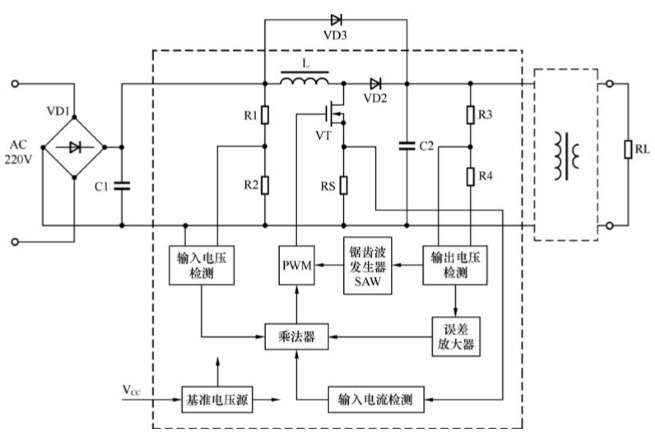 在較大動態范圍內,模擬乘法器的傳輸特性呈線性。當正弦波交流輸入電壓從零上升至峰值時,乘法器將3路輸入信號處理后,輸出相應電平去控制PWM比較器的門限值,然后與鋸齒波比較,產生PWM調制信號,加到場效應功率開關管VT的柵極,調整場效應管漏、源極導通寬度和時間,使它同步跟蹤電網輸入電壓的變化,讓PFC電路的負載相對交流電網呈純電阻特性,使流過一次回路感性電流峰值包絡線緊跟正弦交流輸入電壓變化,獲得與電網輸入電壓同頻同相的正弦波電流。