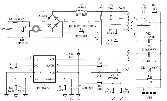 圖為USB手機(jī)充電器電路原理圖,采用Fairchild公司出品的一次繞組反饋(PSR(3))控制器FAN104W。 ![]() 變莊器上的一繞組線(xiàn),通過(guò)這個(gè)繞組上的電壓、電流變化確定電路的工作情況,從而來(lái)調(diào)整電路的工作穩(wěn)定。一次繞組反饋(PSR)與傳統(tǒng)二次繞組反饋光耦和TL431的結(jié)構(gòu)相比,節(jié)約了電路板上的空間,降低了成本。在省去了光耦和TL431等元器件之后,為了實(shí)現(xiàn)高精度的恒流/恒壓(CC/CV)控制特性,必然要采用新的技術(shù)來(lái)監(jiān)控負(fù)載、電源和溫度的實(shí)時(shí)變化及元器件的同批次容差,這就涉及一次繞組調(diào)節(jié)技術(shù)、變壓器容差補(bǔ)償、線(xiàn)纜補(bǔ)償和EMI優(yōu)化技術(shù)。 (1)高壓?jiǎn)?dòng) 市電經(jīng)F1(延時(shí)保險(xiǎn)絲)輸入,經(jīng)DR1(綠色壓敏電阻)過(guò)壓保護(hù)和共模扼流圈L1送給DB1進(jìn)行全波整流。高壓電容C1、C2與電感L3構(gòu)成π形濾波電路,貼片磁阻L2用于濾除差模干擾。直流母線(xiàn)通過(guò)電阻R4(推薦值為100kΩ)連接至FAN104的8腳(HV)。初始上電時(shí),內(nèi)部高壓電流源開(kāi)啟,為HV引腳提供輸入電流IHV,對(duì)電源端VDD外接電容C9充電。當(dāng)VDD電壓達(dá)到IC開(kāi)啟電壓VDD-ON時(shí),內(nèi)部高壓電流源被禁用,阻止IHV流入HV引腳。 IC開(kāi)啟后(在PWM輸出之前),C9是提供IC消耗電流的電能來(lái)源。因此,C9必須足夠大(推薦值為22μF),以便在輔助繞組輸出電壓之前阻止VDD降至IC關(guān)斷電壓VDD-OFF。正常工作時(shí),由輔助繞組經(jīng)VD6、C9整流濾波給FAN104供電。 (2)FAN104W引腳功能 該高度集成的PWM控制器FAN104W具備多種功能,可增強(qiáng)低功率反激轉(zhuǎn)換器的性能。FAN104W專(zhuān)有的拓?fù)浣Y(jié)構(gòu)簡(jiǎn)化了電池充電器應(yīng)用中的電路設(shè)計(jì)。與常規(guī)設(shè)計(jì)或線(xiàn)性變壓器相比,這樣的充電器具有更低的成本、更加小型化,也更加輕便。FAN104W各引腳功能說(shuō)明見(jiàn)表。 表FAN104W各引腳功能說(shuō)明