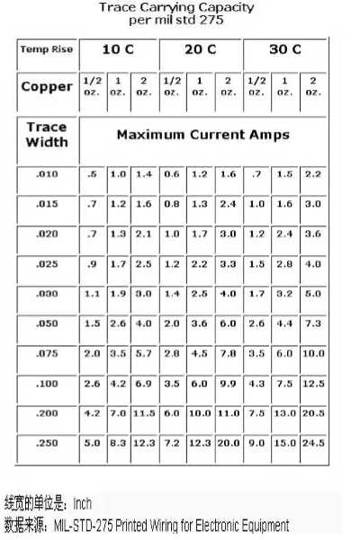 PCB載流能力的計(jì)算一直缺乏權(quán)威的技術(shù)方法、公式,經(jīng)驗(yàn)豐富的Layout工程師依靠個(gè)人經(jīng)驗(yàn)?zāi)茏鞒鲚^準(zhǔn)確的判斷。但是對于Layout新手,不可謂遇上一道難題。 PCB的再留能力取決于以下因素:線寬、線厚(銅箔厚度)、容許溫升。大家都知道,PCB走線越寬,再留能力越大。 但很多人有一個(gè)誤區(qū)比如:假設(shè)在同等條件下,10mil的走線能承受1A,那么50mil的走線能承受多大電流?很多人都認(rèn)為是5A。但其實(shí)不能這樣通過線寬倍數(shù)來計(jì)算載流能力,請看以下來自權(quán)威機(jī)構(gòu)提供的數(shù)據(jù)供大家參考: