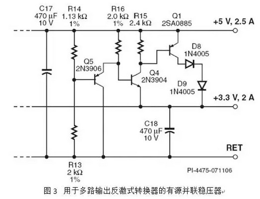 | 一、反激式電源中的鐵氧體磁放大器 對于兩個(gè)輸出端都提供實(shí)際功率(5 V 2 A 和 12 V 3 A,兩者都可實(shí)現(xiàn)± 5%調(diào)節(jié))的雙路輸出反激式電源來說,當(dāng)電壓達(dá)到 12 V 時(shí)會進(jìn)入零負(fù)載狀態(tài),而無法在 5%限度內(nèi)進(jìn)行調(diào)節(jié)。線性穩(wěn)壓器是一個(gè)可實(shí)行的解決方案,但由于價(jià)格昂貴且會降低效率,仍不是理想的解決方案。我們建議的解決方案是在 12 V 輸出端使用一個(gè)磁放大器,即便是反激式拓?fù)浣Y(jié)構(gòu)也可使用。 為了降低成本,建議使用鐵氧體磁放大器。然而,鐵氧體磁放大器的控制電路與傳統(tǒng)的矩形磁滯回線材料(高磁導(dǎo)率材料)的控制電路有所不用。鐵氧體的控制電路(D1 和 Q1)可吸收電流以便維持輸出端供電。該電路已經(jīng)過全面測試。變壓器繞組設(shè)計(jì)為 5 V 和 13 V 輸出。該電路在實(shí)現(xiàn) 12 V 輸出± 5%調(diào)節(jié)的同時(shí),甚至還可以達(dá)到低于 1 W 的輸入功率(5 V 300 mW和12V零負(fù)載) ![]() 二、使用現(xiàn)有的消弧電路提供過流保護(hù) 考慮一下 5 V 2 A 和 12 V 3 A 反激式電源。該電源的關(guān)鍵規(guī)范之一便是當(dāng) 12 V 輸出端達(dá)到空載或負(fù)載極輕時(shí),對 5 V 輸出端提供過功率保護(hù)(OPP)。這兩個(gè)輸出端都提出了± 5%的電壓調(diào)節(jié)要求。 對于通常的解決方案來說,使用檢測電阻會降低交叉穩(wěn)壓性能,并且保險(xiǎn)絲的價(jià)格也不菲。而現(xiàn)在已經(jīng)有了用于過壓保護(hù)(OVP)的消弧電路。該電路能夠同時(shí)滿足 OPP 和穩(wěn)壓要求,使用部分消弧電路即可實(shí)現(xiàn)該功能。 從圖 2 可以看出,R1 和 VR1 形成了一個(gè) 12 V 輸出端有源假負(fù)載,這樣可以在 12 V 輸出端輕載時(shí)實(shí)現(xiàn) 12 V 電壓調(diào)節(jié)。在 5 V 輸出端處于過載情況下時(shí),5 V 輸出端上的電壓將會下降。假負(fù)載會吸收大量電流。R1 上的電壓下降可用來檢測這一大量電流。Q1 導(dǎo)通并觸發(fā) OPP電路。 ![]() 三、有源并聯(lián)穩(wěn)壓器與假負(fù)載 在線電壓 AC 到低壓 DC 的開關(guān)電源產(chǎn)品領(lǐng)域中,反激式是目前流行的拓?fù)浣Y(jié)構(gòu)。這其中的一個(gè)主要原因是其獨(dú)有的成本效益,只需向變壓器次級添加額外的繞組即可提供多路輸出電壓。 通常,反饋來自對輸出容差有嚴(yán)格要求的輸出端。然后,該輸出端會定義所有其它次級繞組的每伏圈數(shù)。由于漏感效應(yīng)的存在,輸出端不能始終獲得所需的輸出電壓交叉穩(wěn)壓,特別是在給定輸出端因其它輸出端滿載而可能無負(fù)載或負(fù)載極輕的情況下更是如此。 可以使用后級穩(wěn)壓器或假負(fù)載來防止輸出端電壓在此類情況下升高。然而,由于后級穩(wěn)壓器或假負(fù)載會造成成本增加和效率降低,因而它們?nèi)狈ψ銐虻奈Γ貏e是在近年來對多種消費(fèi)類應(yīng)用中的空載和/或待機(jī)輸入功耗的法規(guī)要求越來越嚴(yán)格的情況下,這一設(shè)計(jì)開始受到冷落。圖 3中所示的有源并聯(lián)穩(wěn)壓器不僅可以解決穩(wěn)壓問題,還能夠大限度地降低成本和效率影響。 ![]() 該電路的工作方式如下:兩個(gè)輸出端都處于穩(wěn)壓范圍時(shí),電阻分壓器 R14 和 R13 會偏置三極管 Q5,進(jìn)而使 Q4 和 Q1 保持在關(guān)斷狀態(tài)。在這樣的工作條件下,流經(jīng) Q5 的電流便充當(dāng) 5 V輸出端很小的假負(fù)載。 5 V 輸出端與 3.3 V 輸出端的標(biāo)準(zhǔn)差異為 1.7 V。當(dāng)負(fù)載要求從 3.3 V 輸出端獲得額外的電流,而從 5 V 輸出端輸出的負(fù)載電流并未等量增加時(shí),其輸出電壓與 3.3 V 輸出端的電壓相比將會升高。由于電壓差異約超過 100 mV,Q5 將偏置截止,從而導(dǎo)通 Q4 和 Q1 并允許電流從 5 V 輸出端流到 3.3 V 輸出端。該電流將降低 5 V 輸出端的電壓,進(jìn)而縮小兩個(gè)輸出端之間的電壓差異。 Q1 中的電流量由兩個(gè)輸出端的電壓差異決定。因此,該電路可以使兩個(gè)輸出端均保持穩(wěn)壓,而不受其負(fù)載的影響,即使在 3.3 V 輸出端滿載而 5 V 輸出端無負(fù)載這樣差的情況下,仍能保持穩(wěn)壓。設(shè)計(jì)中的 Q5 和 Q4 可以提供溫度補(bǔ)償,這是由于每個(gè)三極管中的 VBE 溫度變化都可以彼此抵消。二極管 D8 和 D9 不是必需的器件,但可用于降低 Q1 中的功率耗散,從而無需在設(shè)計(jì)添加散熱片。 該電路只對兩個(gè)電壓之間的相對差異作出反應(yīng),在滿載和輕負(fù)載條件下基本不起作用。由于并聯(lián)穩(wěn)壓器是從 5 V 輸出端連接到 3.3 V 輸出端,因此與接地的并聯(lián)穩(wěn)壓器相比,該電路的有源耗散可以降低 66%。其結(jié)果是在滿載時(shí)保持高效率,從輕負(fù)載到無負(fù)載的功耗保持較低水平。 四、采用 StackFET?的高壓輸入開關(guān)電源 使用三相交流電進(jìn)行工作的工業(yè)設(shè)備常常需要一個(gè)可以為模擬和數(shù)字電路提供穩(wěn)定低壓直流電的輔助電源級。此類應(yīng)用的范例包括工業(yè)傳動(dòng)器、UPS 系統(tǒng)和能量計(jì)。 此類電源的規(guī)格比現(xiàn)成的標(biāo)準(zhǔn)開關(guān)所需的規(guī)格要嚴(yán)格得多。不僅這些應(yīng)用中的輸入電壓更高,而且為工業(yè)環(huán)境中的三相應(yīng)用所設(shè)計(jì