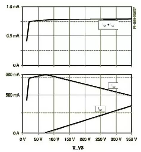 七、浮動(dòng)恒流源允許超寬范圍的輸入電壓 對Power Integrations的多數(shù)產(chǎn)品而言,數(shù)據(jù)手冊中限制的用于確保正常啟動(dòng)和起作用的小漏極電壓為50 V。但是,如果通過外部電源向旁路引腳饋電,則芯片可接收外部供電,且即使在較低的輸入電壓下也可啟動(dòng)和工作。 ![]() 圖8所示的啟動(dòng)電路為浮動(dòng)恒流源,它為整個(gè)輸入電壓范圍內(nèi)的 TinySwitch-III 的旁路(BP)引腳提供大約 600 μA 的恒流。恒流值由 R2 和 VR1 確定: ![]() 該電路源自基本的單晶體管電流源。該電路采用了一個(gè)齊納二極管,為 Q2 (NPN)的基極引出端設(shè)置參考電壓,并以此對流經(jīng)電阻 R2 的固定電壓進(jìn)行編程,從而設(shè)置恒流值。然而,鑒于輸入電源范圍的異常寬廣性,參考齊納二極管的偏置電流在很大范圍內(nèi)會有所差異。這將導(dǎo)致功率耗散增加及編程的恒流發(fā)生偏移。 要克服上述難題,需要由其他的電流源(由 Q1 (PNP)與 R1 形成)提供偏置電流。將等同于VBE 的恒壓強(qiáng)加于 R1,這樣可為整個(gè)工作范圍內(nèi)的參考齊納二極管提供偏置電流補(bǔ)償。 晶體管 Q2 以較低輸入電壓提供恒流,而 Q1 則以較高的輸入電壓提供恒流。圖 2 顯示了電流流經(jīng) Q1 和 Q2 時(shí)的模擬結(jié)果。輸入電壓達(dá)到大約 50 VDC 時(shí),Q2 將提供恒流。輸入電壓達(dá)到50 VDC 及以上時(shí),經(jīng)過 Q2 的電流將減弱,而經(jīng)過 Q1 的電流則呈線性增加。輸入電壓達(dá)到大值 375 VDC 時(shí),則主要由 Q1 提供恒流。R3 用于限制整個(gè)電路在輸入電壓大時(shí)的輸入電流。 ![]() 非線性電流由于齊納二極管 VR1 的非線性活動(dòng)而上升。輸入電壓大約為 60 VDC 時(shí),齊納二極管開始有電壓。 八、用軟啟動(dòng)禁止低成本輸出來遏制電流尖峰 為滿足嚴(yán)格的待機(jī)功耗規(guī)范要求,一些多路輸出電源被設(shè)計(jì)為在待機(jī)信號為活動(dòng)狀態(tài)時(shí)斷開輸出連接。通常情況下,通過關(guān)閉串聯(lián)旁路雙極晶體管(BJT)或 MOSFET 即可實(shí)現(xiàn)上述目的。對于低電流輸出,如果在設(shè)計(jì)電源變壓器時(shí)充分考慮到晶體管的額外壓降情況,則 BJT 可成為 MOSFET 的合適替代品,且成本更為低廉。 圖 1 0所示為簡單的 BJT 串聯(lián)旁路開關(guān),電壓為 12 V,輸出電流強(qiáng)度為 100 mA,并帶有一超大電容(CLOAD)。晶體管 Q1 為串聯(lián)旁路元件,由 Q2 根據(jù)待機(jī)信號的狀態(tài)來控制其開關(guān)。電阻 R1 的值是額定的,這樣可確保 Q1 有足夠的基值電流在小 Beta 和大的輸出電流下以飽和的狀態(tài)工作。PI 建議額外添加一個(gè)電容器(Cnew),用以調(diào)節(jié)導(dǎo)通時(shí)的瞬態(tài)電流。如果不添加 Cnew,Q1 在導(dǎo)通后即迅速進(jìn)入電容性負(fù)載,并因而產(chǎn)生較大的電流尖峰。為調(diào)節(jié)該瞬態(tài)劍鋒,需要增加VT1的容量,這便導(dǎo)致了成本的增加。 用作 Q1 額外“密勒電容”的 Cnew 可以消除電流尖峰。該額外電容可限制 Q1 集電極的 dv/dt值。dv/dt 值越小,流入 Cload 的充電電流就越少。為 Cnew 指定電容值,使得 Q1 的理想輸出 dv/dt 值與 Cnew 值相乘等于流入 R1 的電流。