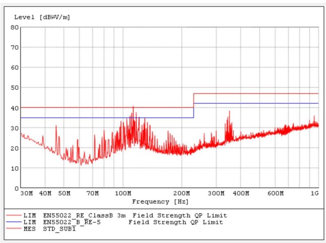 在該產品第一次測試時時發現在350MHz 超標較多,其他地方超標并不明顯。由于該產品包括兩個版本,使用同一機架,因此在分別對兩個版本進行測試時需要更換模塊。 結果發現當再次測試同一模塊是,本次測試結果和以前的測試結果有較大差別,出現在 70MHz 和 400MHz 頻段大范圍出現較大的干擾。 350MHz 仍然存在較大干擾。參見下圖所示: