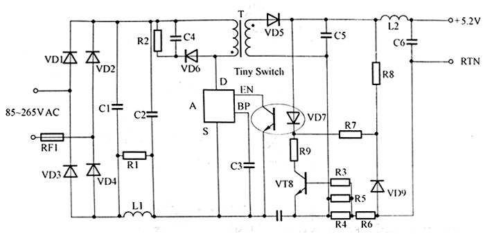 TNY254的低工作頻率(44kHz)使其可以采用如上述簡單的π型濾波器與一個電容C8組合來滿足傳導EMI標準VD6?C4和R2組成鉗位電路,將Tiny Switch漏極引腳關斷電壓尖峰限制在安全值范圍內次級繞組經VD5和C5整流?濾波提供5.2V輸出?L2和C6一起提供輔助濾波?