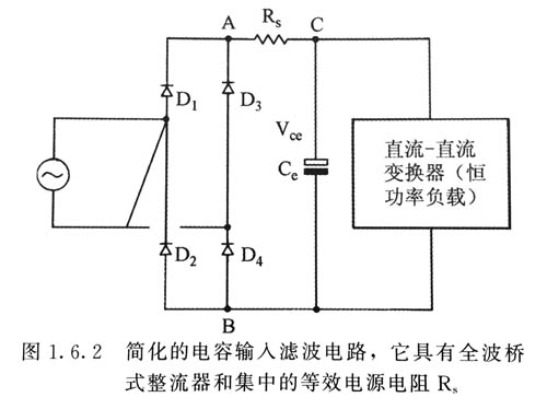 圖所示為橋電路的一種簡化形式。在此簡化電路中,串聯的儲能電容C5和C6由等效電容C來代替,并且等效串聯電阻R,被置于橋式整流器的輸出端來進一步簡化分析。