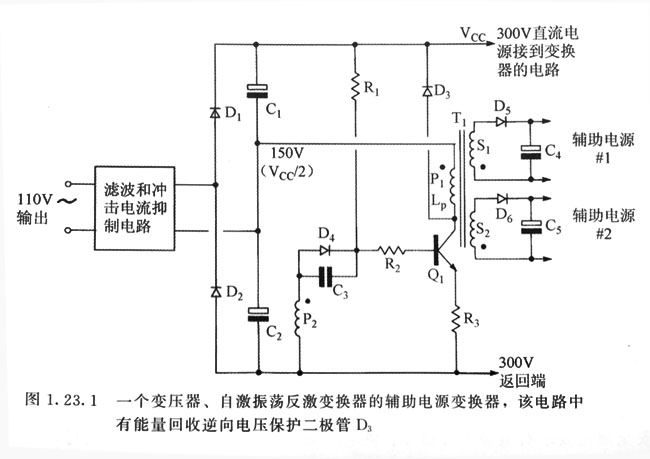 輔助變換器 自激振蕩高頻反激變換器可以做成一個非常小、重量輕的輔助電源適配器。該變換器的輸出繞組能完全地被隔離開,而且它既能對內提供一個主變換器所需的輔助電源適配器,也能對外提供一個輸出輔助電壓,可實現如上述60Hz變壓器那樣的作用。 輔助電源適配器的功率一般要求是非常小的,如5W或更小,可用很小的簡易變換器來實現。圖是一個非調整輸出輔助電源適配器變換器的典型電路,在該電路中,高壓直流電壓對主變換器供電,從它的倍壓整流的150V中心抽頭對自激振蕩反激變換器供電。
