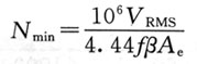 其中Nmin為較小原邊匝數(shù) Vrms為繞組電壓的RMs值(V) ?為頻率(Hz) β為磁通密度(T,典型值為mT) Ae為等效磁心面積(mm2) 本例中