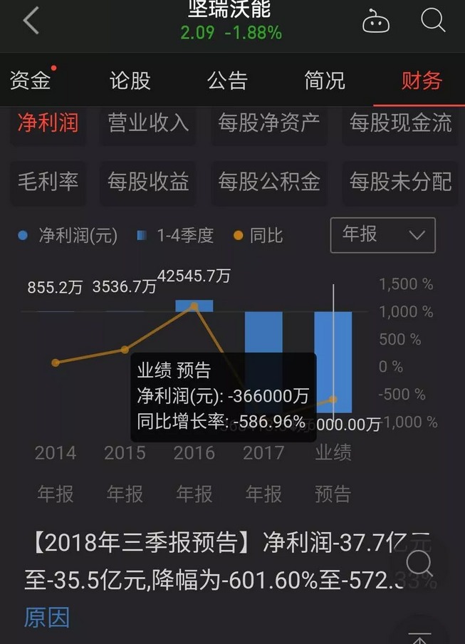 堅瑞沃能8月26日晚披露半年報,2018年上半年實現營業收入32.38億元,同比減少46.62%;凈利潤虧損16.7億元,去年同期盈利5.58億元;基本每股收益為-0.6865元。三季報的預告出來了,虧損37.7億,公司的開工率不到2%,員工基本回家休假去了。