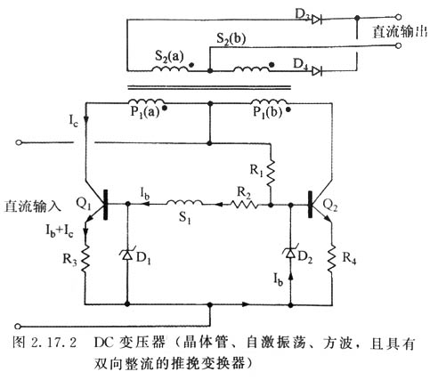 DC-DC變壓器舉例 在本例中,用推挽變換器來說明其工作原理。圖2。17。2表示了一個(gè)典型的自激振蕩方波變換器。這種變換器的特點(diǎn)是以全導(dǎo)通角工作,即不使用脈寬調(diào)制,每個(gè)晶體管的導(dǎo)通占整個(gè)周期的50%。同時(shí)在這種簡(jiǎn)單結(jié)構(gòu)中,變換器沒有調(diào)節(jié)作用,直流輸出電壓會(huì)隨輸入而變化。