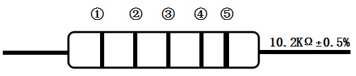 ①第一顏色表示(第一數(shù)字) 棕 1 ②第二顏色表示(第二數(shù)字) 黑 0 ③第三顏色表示(第三數(shù)字) 紅 2 ④第四顏色表示(乘數(shù)) 紅 2 ⑤第五顏色表示(電阻值允許誤差) 綠 ±0.5%