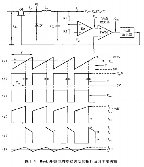 Buck開關型調整器 串接晶體管的高功耗和笨重的工頻變壓器使得線性調整器在現代電子應用中失去了重要地位。而且,高功耗串接元件需要的大散熱片和大體積儲能電容增大了線性調整器的體積。隨著電子技術的發(fā)展,電路的集成化使得電路系統(tǒng)的體積更小。一般的線性調整器輸出負載的功率密度僅為0.2~0.3W/in3,不能滿足電路系統(tǒng)小型化的要求。而且,線性電源適配器不能夠提供數字存儲系統(tǒng)所需要的足夠長的保持時間。 取代線性調整器的開關型調整器早在20世紀60年代就開始應用。一般的,這些新的15W電源適配器使用開關晶體管將輸入直流電壓斬波成方波。方波由占空比調節(jié),并通過低通輸出功率濾波得到直流輸出電壓。 濾波器一般采用電感和輸出電容。通過調節(jié)占空比,可以控制經過輸出電容濾波的電壓平均值。方波脈沖經過低通濾波器濾波后得到的直流輸出電壓等于方波脈沖的平均值Buck開關型調整器典型的拓撲及其波形如圖所示。 使用合適的LC濾波器可將方波脈沖平滑成無紋波直流輸出,其值等于方波脈沖的平均值。整個電路采用輸出負反饋,通過檢測輸出電壓并結合負反饋控制占空比,穩(wěn)定輸出電壓不受輸入網壓和負載變化的影響。 目前高頻開關電源適配器的功率密度可達20W/in3,而且可以獲得與輸入隔離的多組輸出。它們無需工頻變壓器,效率達到75%~95%。有些DC/DC變換器功率密度可高達50w/in3 Buck調整器的基本符號和波形 補充: 電源適配器廠家介紹了以下開關型調整器的恒頻工作方式,在這類調整器中,功率器件的導通時間(Ton)是可調的,而整個開關周期(T)是固定的,即開關頻率(1/T)也是固定的。 比例Ton/T一般稱為占空比。在某些書中,占空比用Ton/(Ton+Toff)表示,其中Toff是功率器件的關斷時間,因此Ton+Toff=T。 除了恒頻工作方式,還有導通時間固定而頻率可調的工作方式,或者導通時間和頻率均可調的工作方式。 dl、di、dV、dv、dT和dt的用法不是很嚴格,一般用來表示△l、△V和△的變化量。例如,△∥△t用導數d/dt表述,表示電流相對時間的變化量或波形的斜率。 12w電源適配器Buck調整器的基本工作方式 Buck調整器的基本電路如圖1。4所示。晶體管Q1與直流輸入電壓V串聯,通過Q1硬開通和硬關斷,在V1處產生方波電壓。采用恒頻控制方式,占空比可調,Q1導通時間為T。Q1導通時,V1點電壓為V(設Q1導通,壓降為零),電流通過串接電感L流入輸出端。Q1關斷時,電感L產生反電動勢,使V1點電壓迅速下降到零,并變負值直至被二極管D1(也稱續(xù)流二極管)鉗位于-0.8V。 設此刻二極管D壓降也為零,則V點電壓波形為矩形波,如圖所示,T時段電壓為V,其余時段電壓為零。該方波的電壓平均值為V7/7。LC濾波器接于Ⅵ和V之間,它使輸出點V成為幅值等于V7。/7的無尖峰無紋波的直流電壓。 采樣電阻R和R2檢測輸出電壓V,并將其輸入誤差放大器(EA)與參考電壓V進行比較。被放大的誤差電壓V被輸入到脈寬調制器(電壓比較器)PWM。PWM比較器的另一個輸入是周期為T的鋸齒波,如圖所示,其幅值一般為3V。PWM電壓比較器產生矩形波脈沖,即圖(c)中的V=,它從鋸齒波起點開始到鋸齒波與誤差放大器輸出電壓交點結束。因此,PwM輸出的脈沖寬度T=與誤差放大器輸出電壓成比例。 PWM脈沖輸入到電流放大器并以負反饋方式控制開關管Q1的通斷。其邏輯關系是:若輸入電壓V稍升高,則EA輸出電壓V將降低使鋸齒波與V交點提前,Q1導通時間T。縮短使輸出電壓V0=VdcTon/T保持不變。同理,若V下降,則導通時間7正比的延長使保持不變。Q1導通時間的改變使采樣電壓總是等于參考電壓,即V0R2/(R2+R1)=Vref。 ![]()