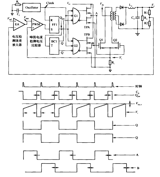 24W電源適配器電流模式控制電路有兩個反饋環,如圖所示:一個響應速度慢的外環通過R1、B2和誤差放大器EA檢測直流輸出電壓,從而產生控制電壓V;另外一個是由R1,V和脈沖寬度調節器PWM構成的快速響應的電流內環,通過R1檢測開關管的峰值電流(即峰值電感電流)并逐周期限流以保持此峰值電流恒定。這種方式可以解決推挽電路的偏磁問題,在解決偏磁問題的其他方法。不是那么可靠的情況下,電流模式控制使得推挽電路變得更加實用。此外,由于開關管的電流波形峰值恒定,也簡化了反饋環路的設計。 補充:本例中所用變換器為正激型拓撲,副邊電流折射到原邊,通過檢測流過Q1和Q2的公共電流,電流內環有效控制輸出電感L的電流。電流內環通過逐周期調節保持L的峰值電流恒定,僅在緩慢地響應輸出電壓調整時調節電流。因此,將L、的峰值電流作為控制參數,這就將L排除在電壓外環的小信號傳遞函數之外,使得閉環響應速度更快。同時,由于電流為控制參數,使得限流和短路保護成為電流模式控制的固有特性。又由于電流被逐周期控制,因此可以有效控制Q1和Q2電流不平衡,變壓器T不存在飽和問題。并且,輸入電壓的任何變化都被L上的峰值輸出電流(變化)抵消,因此變換器具有優良的網壓調節性能。![]() 電源適配器電流饋電拓撲 如圖所示,電流饋電拓撲經過一個輸入電感(扼流圈)來從輸入端獲取能量。圖中推挽正激變換器的變壓器頂端從輸入電感L獲得能量。電路的輸入是一個高內阻的電流源(輸入電感L1),而不是低內阻的整流濾波電容或電池。較高的源阻抗可有效地解決變壓器T1的偏磁問題,并且具有其他一些優點。 電源適配器電流模式控制 在以前討論的所有電壓型拓撲中,輸出電壓都是的控制參數。在這些電路中,對負載電流變化的調整過程是:電流變化引起輸出電壓的微小變化,而誤差放大器會檢測到這個變化并且調節開關管的導通時間以保持輸出電壓恒定,但電壓型拓撲并不直接檢測輸出電流。 在19世紀80年代,一種電壓和電流同時被檢測的新拓撲—電流模式拓撲出現了。雖然這種拓撲在此以前也為人所知,但由于需要分立元件實現控制,所以應用并不廣泛。當Uni-trode推出一款能實現電流模式控制所有功能的新型PwM芯片一UC1846時,電流控制技術的優勢很快被大家認同并得到了廣泛應用。 補充:如今,市場上已經出現了許多功能類似的電流模式控制芯片。 Unitrode成為了T公司的一部分。 UC1846采用電流模式控制,輸出兩路相位差為180°的PwM脈沖信號,可應用于推挽、半橋、全橋、交錯正激或者反激變換器。現在也有較廉價的單端PwM控制器—UC1842,可應用于電流模式的單端變換器,如正激、反激和Buck調整器。 電源適配器電流模式控制的優點 防止推挽變換器的偏磁問題 當推挽變換器的變壓器磁心工作點偏離磁滯回線原點,就會出現這種現象。其后果是磁心飽和,使一只晶體管承受的電流遠大于另外一只,如圖所示。