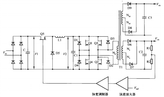 電流模式檢測每個周期的電流脈沖,并且通過調整晶體管導通時間使交替電流脈沖峰值相等。這一特點使推挽電路可應用于各種新設計,并且對其他拓撲也非常有價值。例如,電流模式出現之前,為可靠防止偏磁,往往選擇沒有偏磁現象的正激變換器,而這提高了設計成本。 從式可知,正激變換器的初級電流峰值為3.13(P/V)。而由式可知,推挽電路的電流峰值只有它的一半,即1.56(P/V)。在小功率場合,盡管在同等輸出功率條件下,正激變換器峰值電流是推挽電路的兩倍,但由于只用一個晶體管,其應用還是比較廣泛的。但在大功率場合,正激變換器峰值電流是推挽電路的兩倍的問題就顯得非常突出了。推挽拓撲非常適用于通信電源適配器的場合,其輸入電壓范圍為38~60V,而可保證沒有偏磁問題的電流模式推挽電路正適用于這種電源適配器。 對輸入網壓變化無誤差放大器延時的快速響應(電壓前饋特性) 輸入網壓變化會立即引起晶體管導通時間調整是電流模式本身固有的特性。與傳統的電壓模式不同,這種響應無需等到輸出變化反饋到誤差放大器時才發生,因此沒有延遲。具體情況將在后面詳細討論。 反饋環路設計的簡化 前面討論的所有拓撲(反激變換器除外)都有一個LC輸出濾波器。在略大于諧振頻率 時,LC濾波器可造成較大180°的相移,且隨頻率的提高,輸出輸入的電壓增益會快速下降。隨著頻率的上升,串聯L支路阻抗會上升,而并聯支路阻抗會下降。