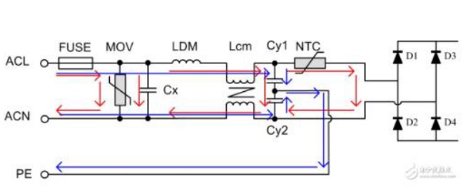 | 一、抗浪涌的電路分析 如圖1所示為小型電源適配器模塊中常用的EMC前級(jí)原理圖,F(xiàn)USE為保險(xiǎn)絲,MOV為壓敏電阻,Cx為X電容,LDM為差模電感,Lcm為共模電感,Cy1和Cy2為Y電容,NTC為熱敏電阻。其中Y電容、共模電感等的主要作用雖然不是為了改善電路的浪涌抗擾度,但它們卻間接地影響了抗浪涌電路的設(shè)計(jì)。 對(duì)ACL與ACN之間施加的浪涌電壓稱(chēng)為差模浪涌電壓,差模路徑如圖中紅線所示;對(duì)ACL(或ACN)與PE之間施加的電壓稱(chēng)為共模浪涌電壓,共模路徑如圖中藍(lán)線所示。 在設(shè)計(jì)抗浪涌電路前必須先確定相應(yīng)的“電磁兼容標(biāo)準(zhǔn)”,如IEC/EN61000-4-5(對(duì)應(yīng)GB/T17626($2.1792).5)中規(guī)定了浪涌抗擾度要求、試驗(yàn)方法、試驗(yàn)等級(jí)等。下面我們將以該標(biāo)準(zhǔn)的規(guī)定為基礎(chǔ)來(lái)討論抗浪涌電路的設(shè)計(jì)。 浪涌發(fā)生電路在輸出開(kāi)路時(shí),產(chǎn)生1.2/50μs的浪涌電壓,而在短路時(shí)將產(chǎn)生8/20μs的浪涌電流。 發(fā)生器的有效輸出阻抗為2Ω,故當(dāng)開(kāi)路電壓峰值為XKV時(shí),短路峰值電流為(X/2)KA。 當(dāng)對(duì)ACL(或ACN)和PE之間進(jìn)行抗浪涌測(cè)試時(shí),在耦合電路上又串入了10Ω的電阻,忽略掉串聯(lián)耦合電容的影響,則短路峰值電流變?yōu)榧s(X/12)KA。