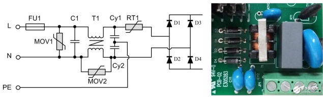 二、相關(guān)器件介紹 1.壓敏電阻 壓敏電阻的選型重要的幾個(gè)參數(shù)為:較大允許電壓、較大鉗位電壓、能承受的浪涌電流。 首先應(yīng)保證壓敏電阻較大允許電壓大于電源適配器輸出電壓的較大值;其次應(yīng)保證較大鉗位電壓不會(huì)超過(guò)后級(jí)電路所允許的較大浪涌電壓;較后應(yīng)保證流過(guò)壓敏電阻的浪涌電流不會(huì)超過(guò)其能承受的浪涌電流。 其他參數(shù)如額定功率、能承受的較大能量脈沖等,通過(guò)簡(jiǎn)單驗(yàn)算或?qū)嶒?yàn)即可確定。 2.Y電容 在進(jìn)行共模浪涌測(cè)試時(shí),若考慮成本等因素,在共模路徑中未加入壓敏電阻或其他用于鉗位電壓的器件時(shí),應(yīng)保證Y電容耐壓高于測(cè)試電壓。 3.輸入整流二極管 假設(shè)浪涌電壓經(jīng)壓敏電阻鉗位后,較大鉗位電壓大于輸入整流二極管能承受的較大反向電壓,則二極管可能會(huì)被損壞。因此應(yīng)選擇反向耐壓大于壓敏電阻較大鉗位電壓的二極管作為輸入整流二極管。 4.共模電感 理論上共模電感僅在共模路徑中起作用,但是因?yàn)楣材k姼袃蓚€(gè)繞組并非完全耦合,未耦合部分將在差模路徑中作為差模電感,影響EMC特性。 三、實(shí)例分析 背景:以某型號(hào)的電源適配器模塊為例,該模塊是周立功致遠(yuǎn)電子為某客戶定制的電源適配器模塊,輸入85VAC~350VAC,且EMC前級(jí)電路電路嵌入到模塊中。抗浪涌要求差模電壓3KV,共模電壓6KV。更換更大的保險(xiǎn)絲后可承受6KV差模電壓。其前級(jí)原理圖及對(duì)應(yīng)實(shí)物圖如圖2所示