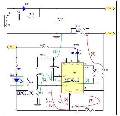 如(1)(2)(3)綠線所示,R11的地和R14的地連接到芯片的地,再連接到EC4電解電容的地。注意不可連到變壓器的地,因為變壓器次級A->D3->EC4->次級B形成功率環,如果ME4312芯片的地接到次級B線到EC4電容之間,受到較強的di/dt干擾會導致系統的不穩定等因素。