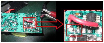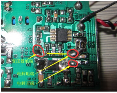 通過斷開PCB銅箔使用一根導線連到輸出電容地,隔開ME4312B芯片地,如下圖: