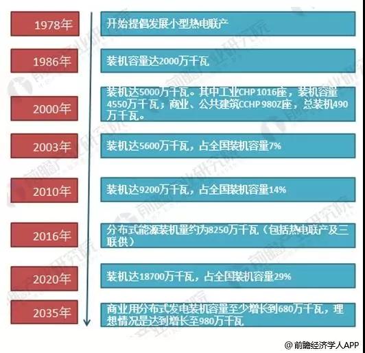 此外,為進一步推進"分布式熱電聯產系統"的發展列為長遠發展規劃,并提出力爭2020年在50%的新建辦公樓或商用樓群中,采用"分布式熱電聯產"模式,將15%現有建筑的"供能系統"改建成"分布式熱電聯產"模式;到2035年,商業用分布式發電裝機容量至少增長到680萬千瓦,理想情況是達到增長至980萬千瓦。