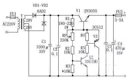 | 1、3~25V電壓可調穩壓電路圖 此穩壓電源適配器可調范圍在3.5V~25V之間任意調節,輸出電流大,并采用可調穩壓管式電路,從而得到滿意平穩的輸出電壓。 工作原理:經整流濾波后直流電壓由R1提供給調整管的基極,使調整管導通,在V1導通時電壓經過RP、R2使V2導通,接著V3也導通,這時V1、V2、 V3的發射極和集電極電壓不再變化(其作用完全與穩壓管一樣)。 調節RP,可得到平穩的輸出電壓,R1、RP、R2與R3比值決定本電路輸出的電壓值。 元器件選擇:變壓器T選用80W~100W,輸入AC220V,輸出雙繞組AC28V。FU1選用1A,FU2選用3A~5A。 VD1、VD2選用 6A02。RP選用1W左右普通電位器,阻值為250K~330K,C1選用3300μF/35V電解電容,C2、C3選用0.1μF獨石電容,C4選用 470μF/35V電解電容。 R1選用180~220Ω/0.1W~1W,R2、R4、R5選用10KΩ、1/8W。V1選用2N3055,V2選用 3DG180或2SC3953,V3選用3CG12或3CG80 ![]() 2、10A3~15V穩壓可調電源電路圖 無論檢修電腦還是電子制作都離不開穩壓電源,下面介紹一款直流電壓從3V到15V連續可調的穩壓電源,較大電流可達10A,該電路用了具有溫度補償特性的,高精度的標準電壓源集成電路TL431,使穩壓精度更高,如果沒有特殊要求,基本能滿足正常維修使用,電路見下圖。 ![]() 其工作原理分兩部分,第一部分是一路固定的5V1.5A穩壓電源電路。第二部分是另一路由3至15V連續可調的高精度大電流穩壓電路。第一路的電路非常簡單,由變壓器次級8V交流電壓通過硅橋QL1整流后的直流電壓經C1電解電容濾波后,再由5V三端穩壓塊LM7805不用作任何調整就可在輸出端產生固定的5V1A穩壓電源,這個電源適配器在檢修電腦板時完全可以當作內部電源使用。 第二部分與普通串聯型穩壓電源基本相同,所不同的是使用了具有溫度補償特性的,高精度的標準電壓源集成電路TL431,所以使電路簡化,成本降低,而穩壓性能卻很高。 圖中電阻R4,穩壓管TL431,電位器R3組成一個連續可調得恒壓源,為BG2基極提供基準電壓,穩壓管TL431的穩壓值連續可調,這個穩壓值決定了穩壓電源的較大輸出電壓,如果你想把可調電壓范圍擴大,可以改變R4 和R3的電阻值,當然變壓器的次級電壓也要提高。變壓器的功率可根據輸出電流靈活掌握,次級電壓15V左右。