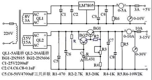 橋式整流用的整流管QL用15-20A硅橋,結構緊湊,中間有固定螺絲,可以直接固定在機殼的鋁板上,有利散熱。調整管用的是大電流NPN型金屬殼硅管,由于它的發熱量很大,如果機箱允許,盡量購買大的散熱片,擴大散熱面積,如果不需要大電流,也可以換用功率小一點的硅管,這樣可以做的體積小一些。濾波用50V4700uF電解電容C5和C7分別用三只并聯,使大電流輸出更穩定,另外這個電容要買體積相對大一點的,那些體積較小的同樣標注50V4700uF盡量不用,當遇到電壓波動頻繁,或長時間不用,容易失效。
