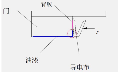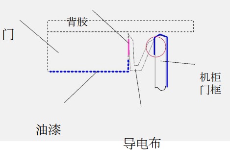 仔細觀察門結構,發現問題如下:導電布靠背膠粘貼在門的側面, 背膠是不導電的,當關門時靠壓力 P 使導電布后部與門保持電接觸。 但本機柜門側邊粘貼導電布的部位,油漆涂得比較靠內(如圖中紅色圈所示),使得導電布后部無法與機柜金屬體接觸上。