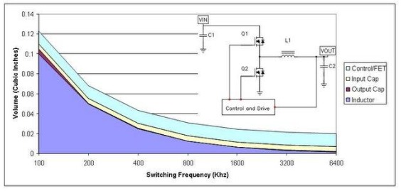 為您的電源選擇較佳的工作頻率是 一個復雜的權衡過程,其中包括尺寸、效 率以及成本。通常來說,低頻率設計往往 是較為高效的,但是其尺寸較大且成本也 較高。雖然調高頻率可以縮小尺寸并降低 成本,但會增加電路損耗。接下來,我們 使用一款簡單的降壓電源來描述這些權衡過程。 我們以濾波器組件作為開始。這些組 件占據了電源體積的大部分,同時濾波器 的尺寸同工作頻率成反比關系。另一方面, 每一次開關轉換都會伴有能量損耗;工作 頻率越高,開關損耗就越高,同時效率也就越低。其次,較高的頻率運行通常意味 著可以使用較小的組件值。因此,更高頻 率運行能夠帶來極大的成本節約。 圖 1 顯示的是降壓電源頻率與體積 的關系。頻率為 100 kHz 時,電感占據 了電源體積的大部分(深藍色區域)。如果 我們假設電感體積與其能量相關,那么其 體積縮小將與頻率成正比例關系。由于某 種頻率下電感的磁芯損耗會極大增高并 限制尺寸的進一步縮小,因此在此情況下 上述假設就不容樂觀了。如果該設計使用 陶瓷電容,那么輸出電容體積(褐色區域) 便會隨頻率縮小,即所需電容降低。另一 方面,之所以通常會選用輸入電容,是因 為其具有紋波電流額定值。該額定值不會 隨頻率而明顯變化,因此其體積(黃色區域) 往往可以保持恒定。另外,電源的半導體 部分不會隨頻率而變化。這樣,由于低頻 開關,無源器件會占據電源體積的大部分。 當我們轉到高工作頻率時,半導體(即半導 體體積,淡藍色區域)開始占據較大的空間 比例。