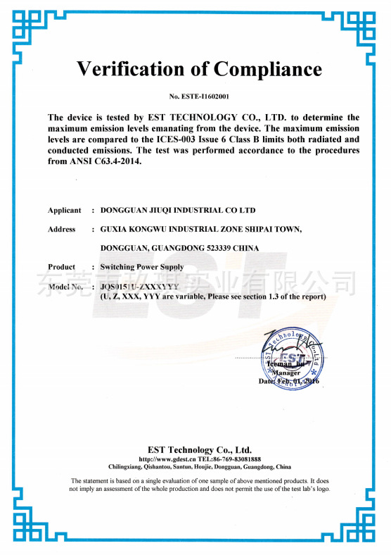 產品系列 15W插墻式電源適配器 產品型號 JQS0151U-ZXXXYYYY