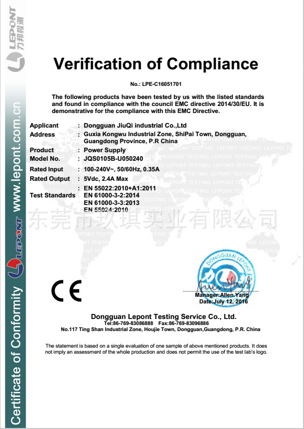 其次,了解下電源適配器的銘牌,所有CE認證的電源適配器,其銘牌上的CE標志高度一定是大于5mm,這是強制性的要求,另外新的CE標準,銘牌上必須備注生產廠家的名稱及詳細地址。