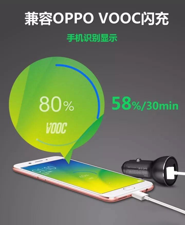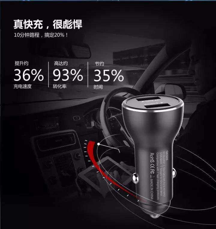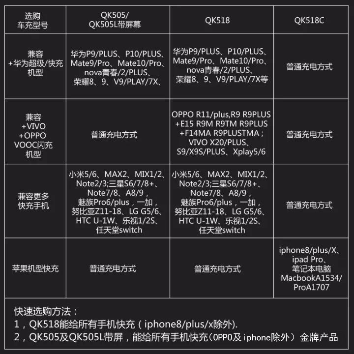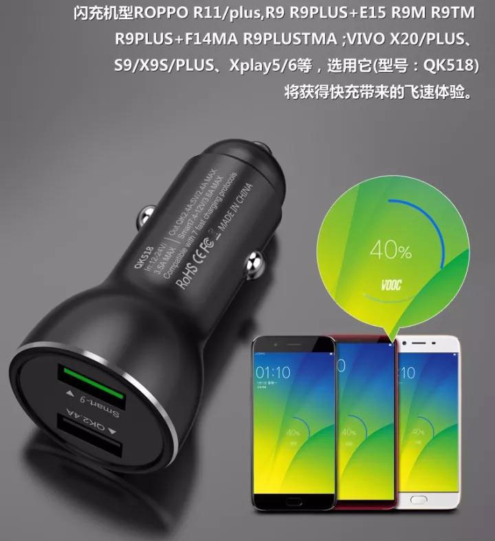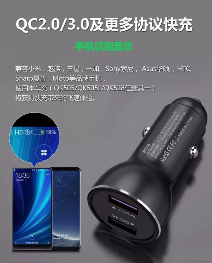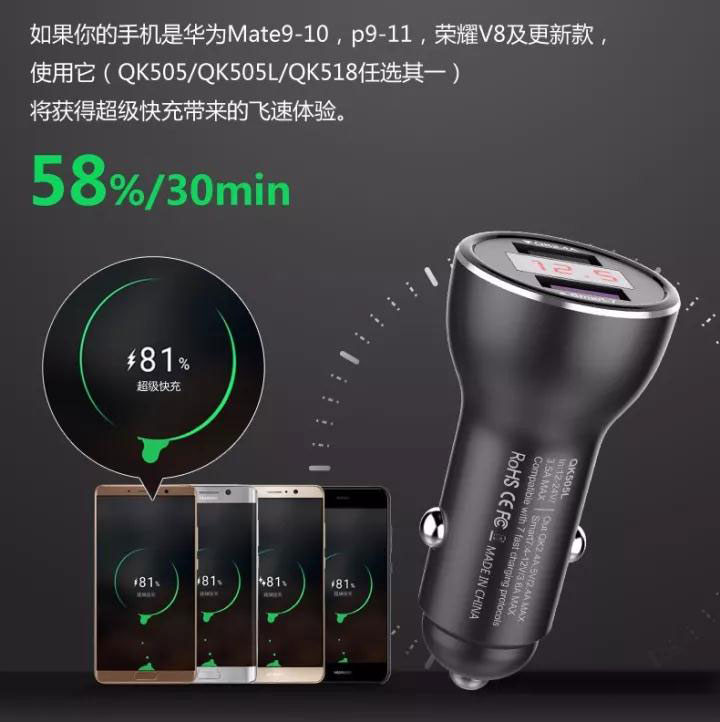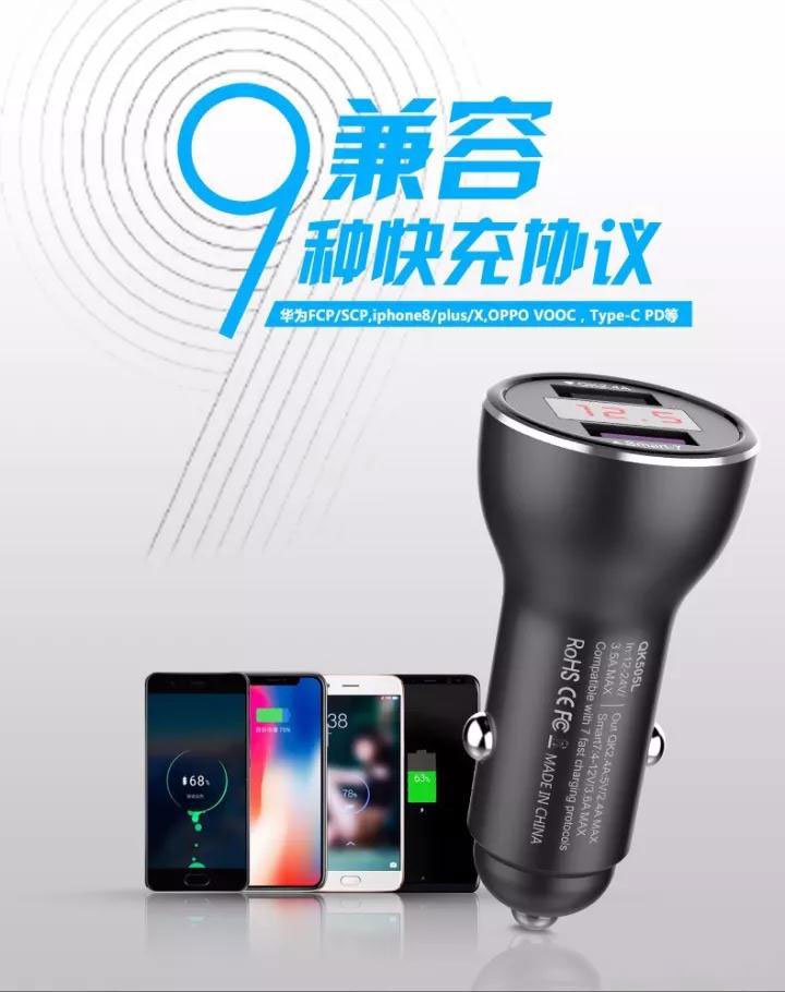 最新專利高品質車載充電器兼容 華為P9/10 MATE 9/10超級快充 OPPIO VOOC閃充及QC3.0/2.0等9種充電協議的安卓系統全功能快充的車載充電器。其中型號QK518C Type-C接口版實現IPHONE8/X PD快速充電。